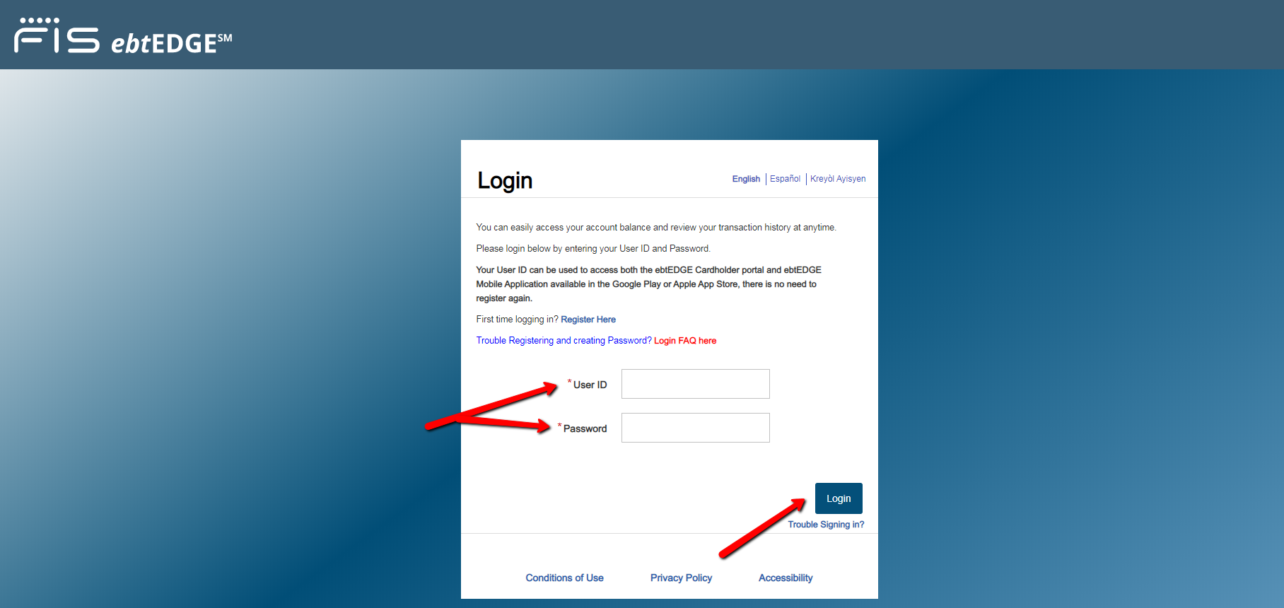 Once you are on the EBT Edge website, click Cardholder Login and enter your User ID and Password. You must log into your account to check your EBT balance.