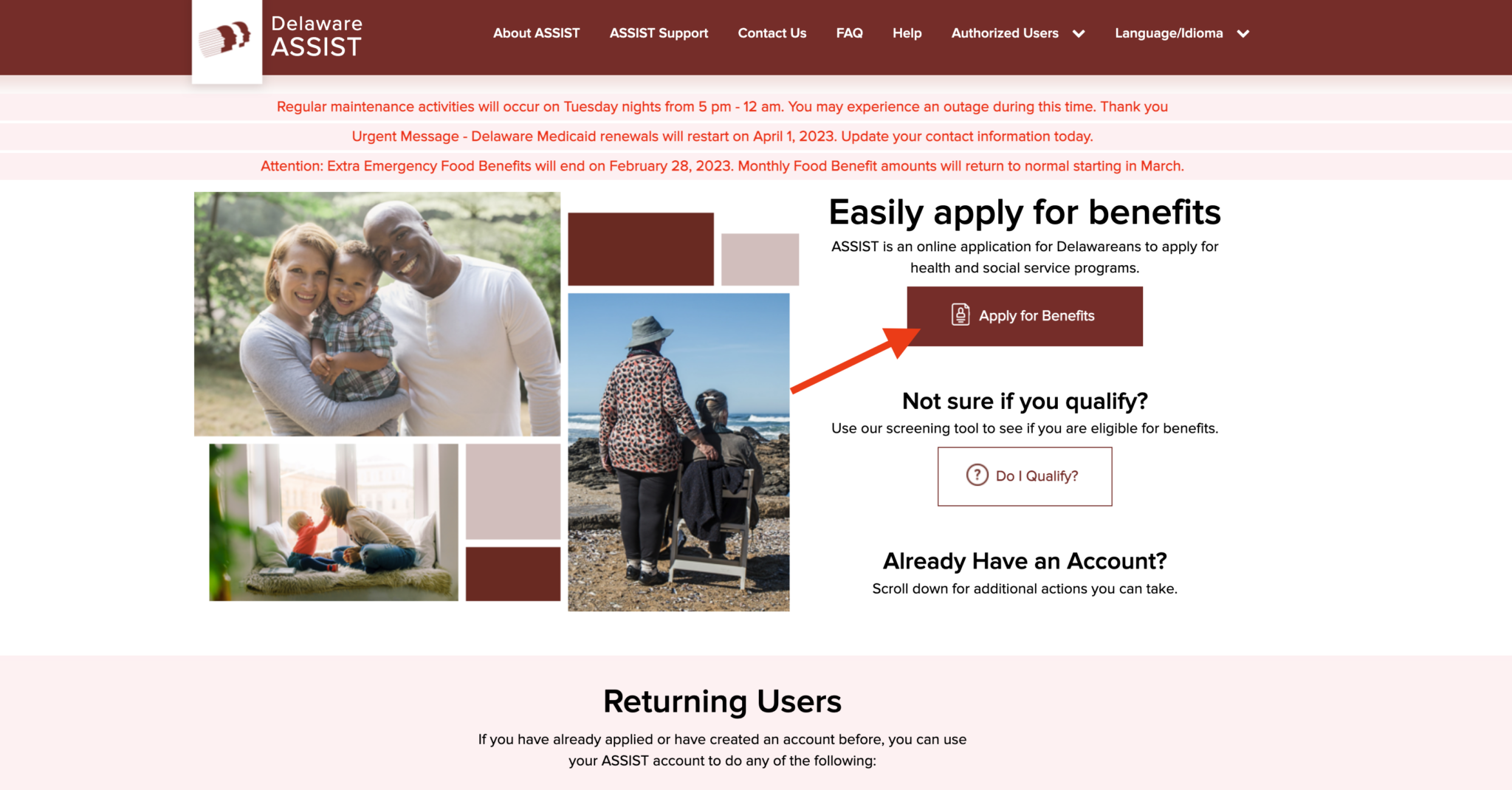 To complete an online application, visit the Delaware ASSIST webpage. Once on the website, click the “Apply for Benefits” button located on the right-side of the page.