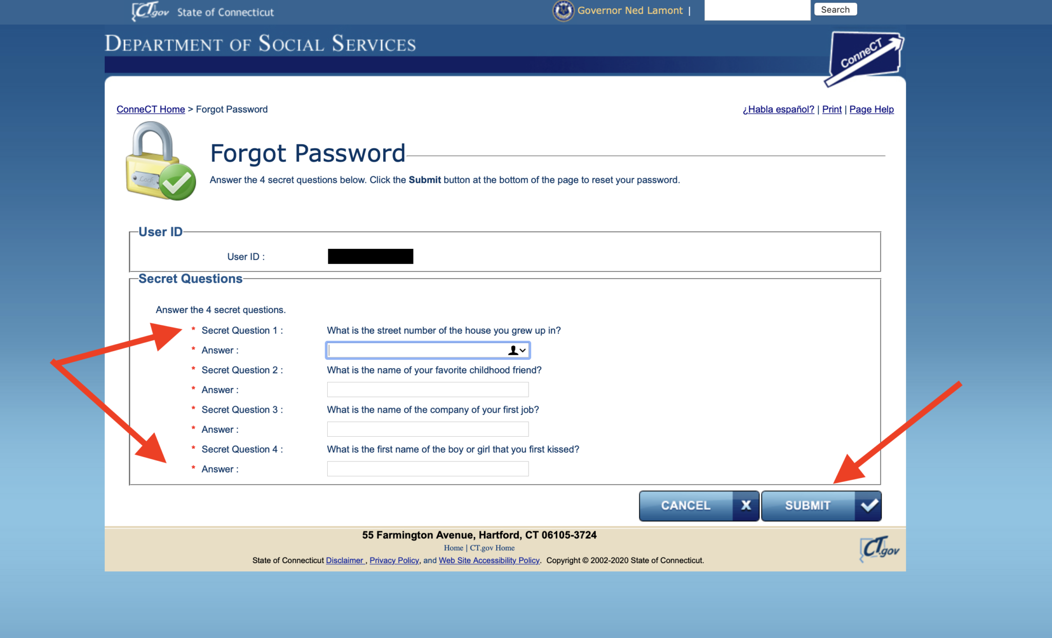 After clicking submit, you will be taken to new page where you will be asked to answer four secret questions. These are questions you set-up when you created your Connect CT Gov account.