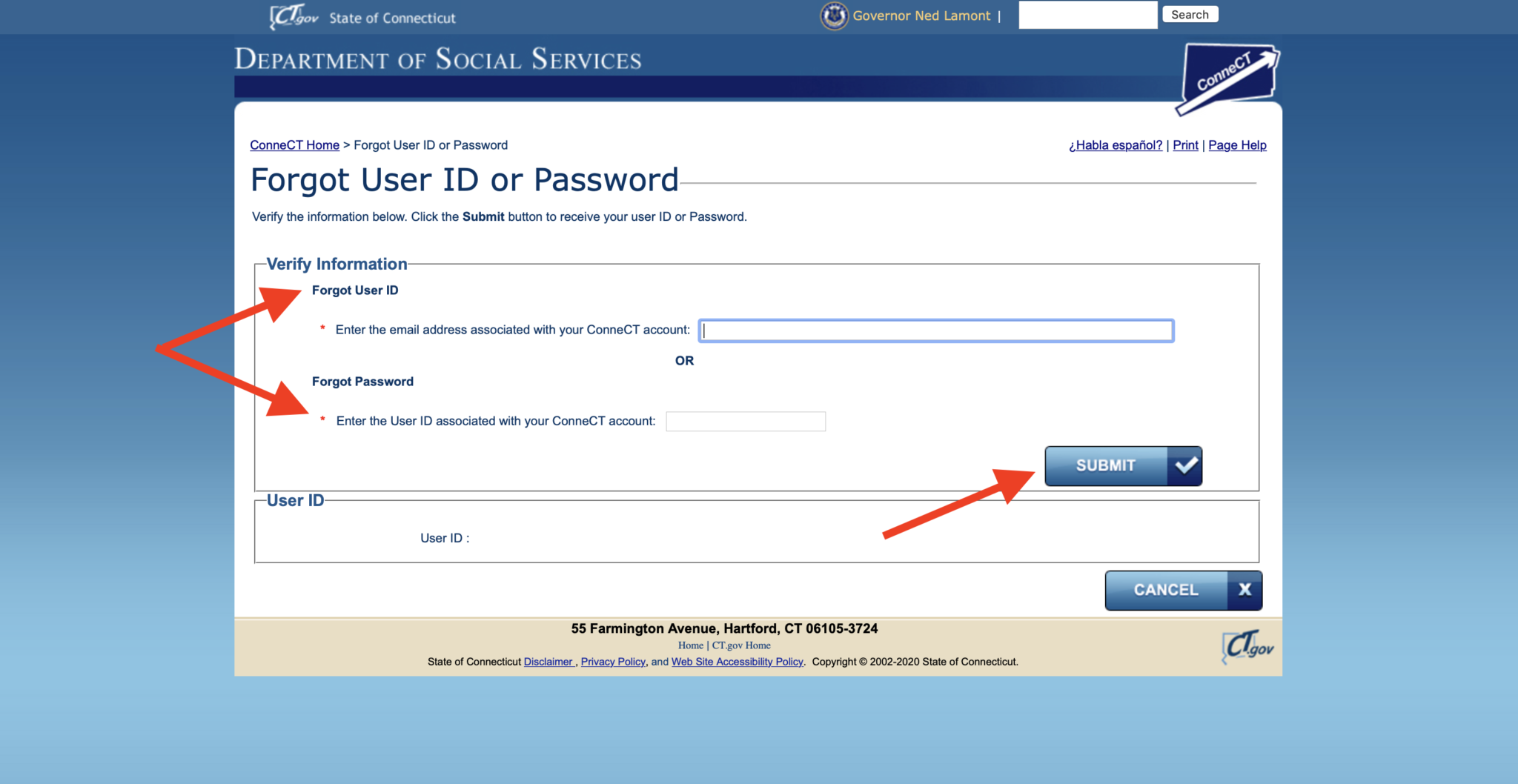 Step 2 – Go to the Connect CT Forgot User ID Page