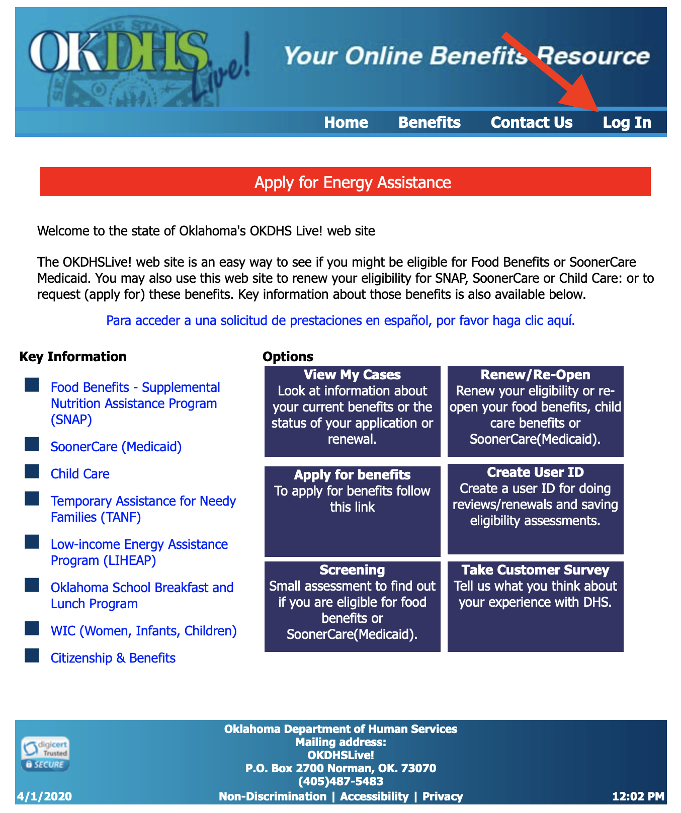 You can apply for Oklahoma food stamp benefits online through the OKDHSLive.org website. To start your application for SNAP benefits, click this link to login your account. Then, click the “Apply for Benefits” option in your OKDHSLive account.