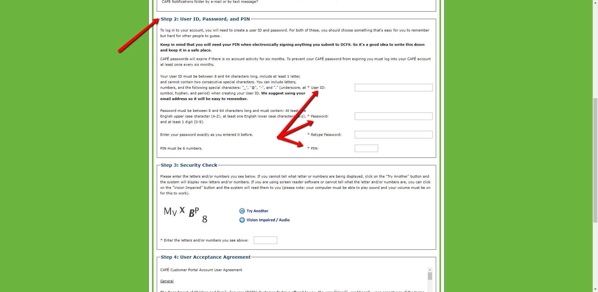 After you selected your User ID, Password, and PIN, you can proceed to complete the security check and review the User Agreement. For the security check, type in the letters and numbers shown into the box provided.