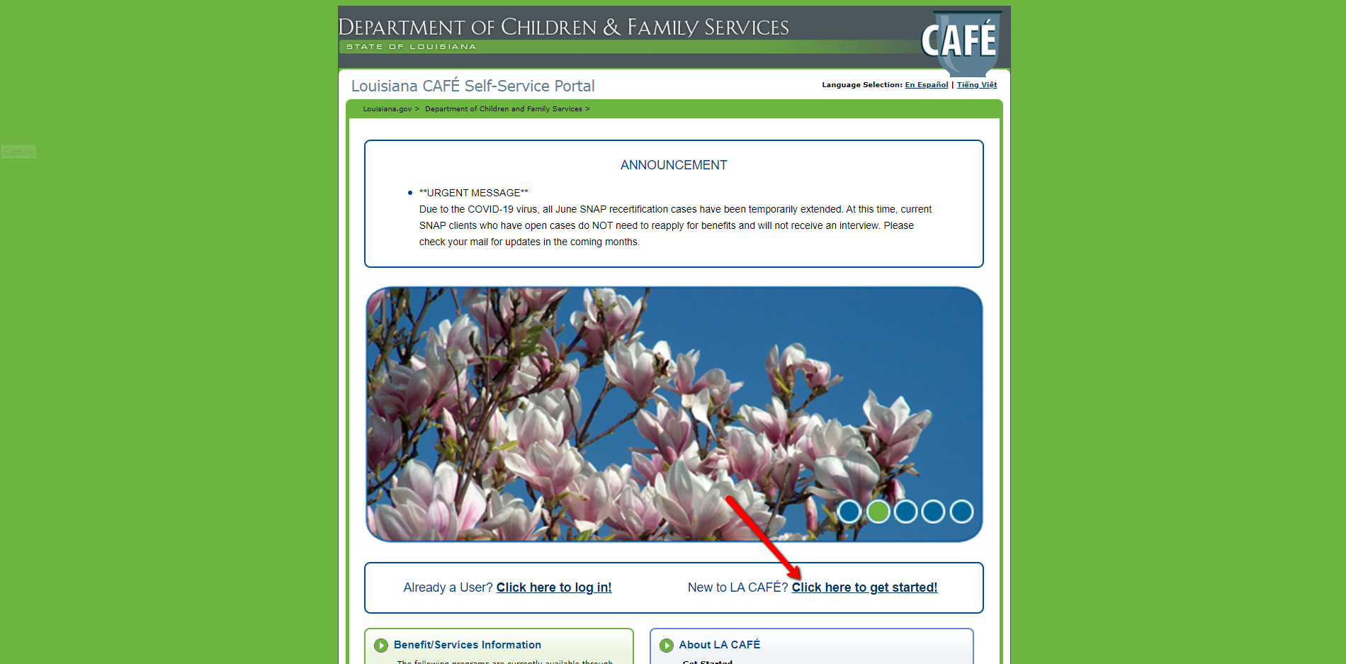 You will be taken to a new page that shows the Louisiana CAFE Self Service main page. Once on the page, locate and click the link that says, “New to LA CAFE? Click here to get started!“