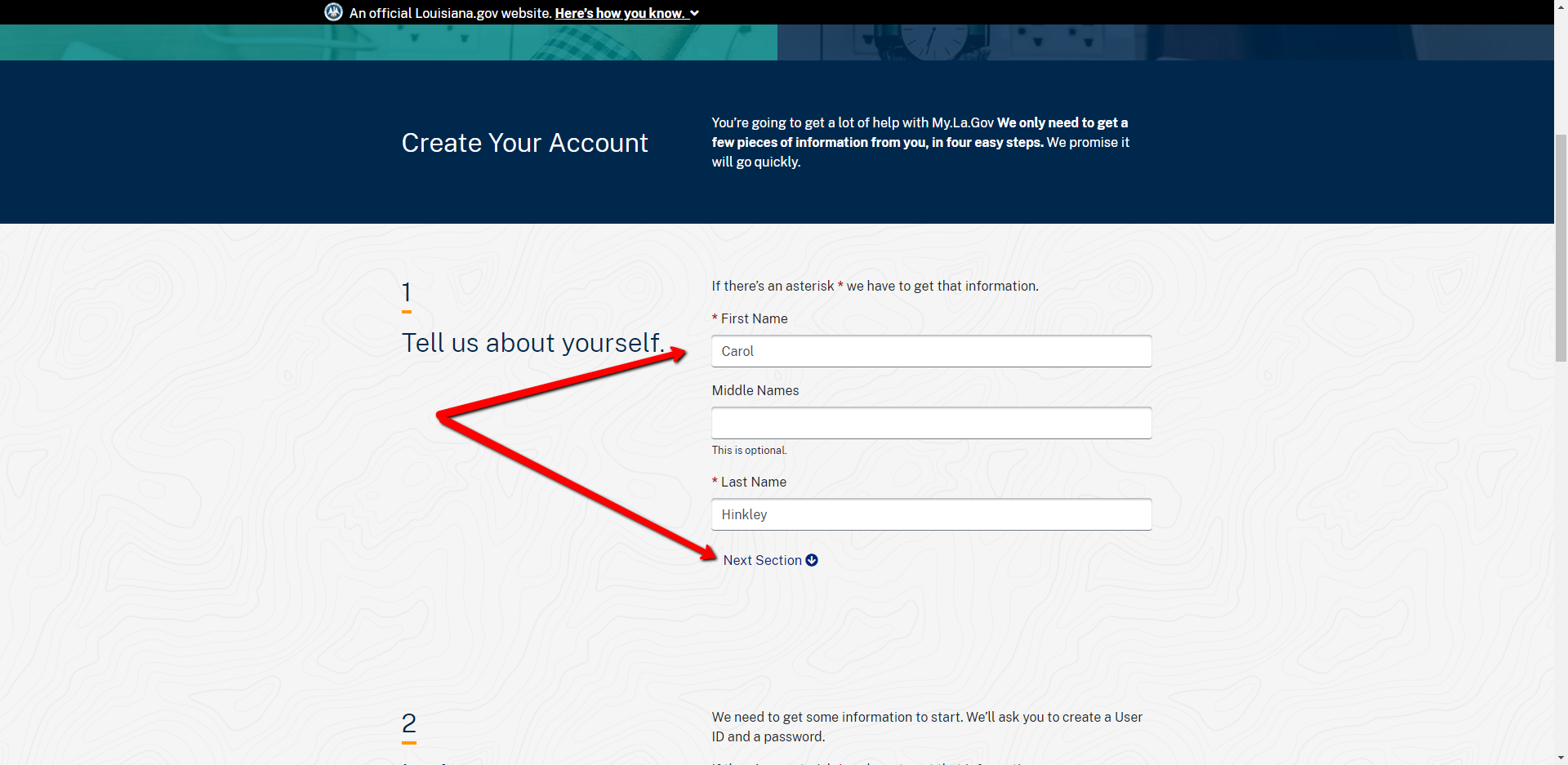 You will now be taken to a new page on the My.La.gov website. This is where you can complete your account registration. Start be filling in your first and last name.