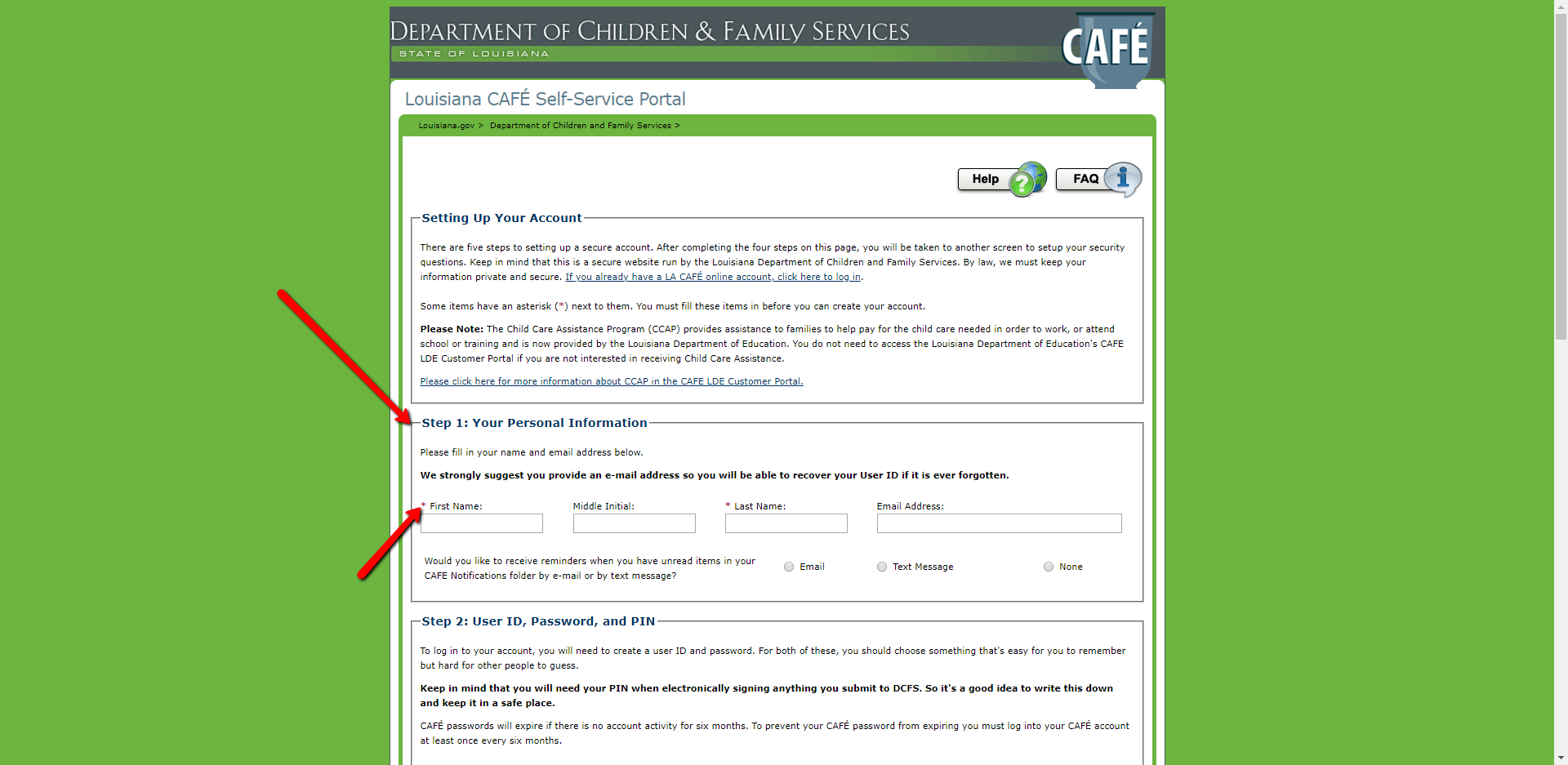 Begin your creating your Louisiana CAFE account by entering your personal information. This includes: