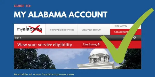 If you would like to apply for food stamp benefits in Alabama, you can do that online through your MyAlabama.gov Account or your MyDHR account. For more instructions on how to apply, check out our Alabama Food Stamps Application Guide here.