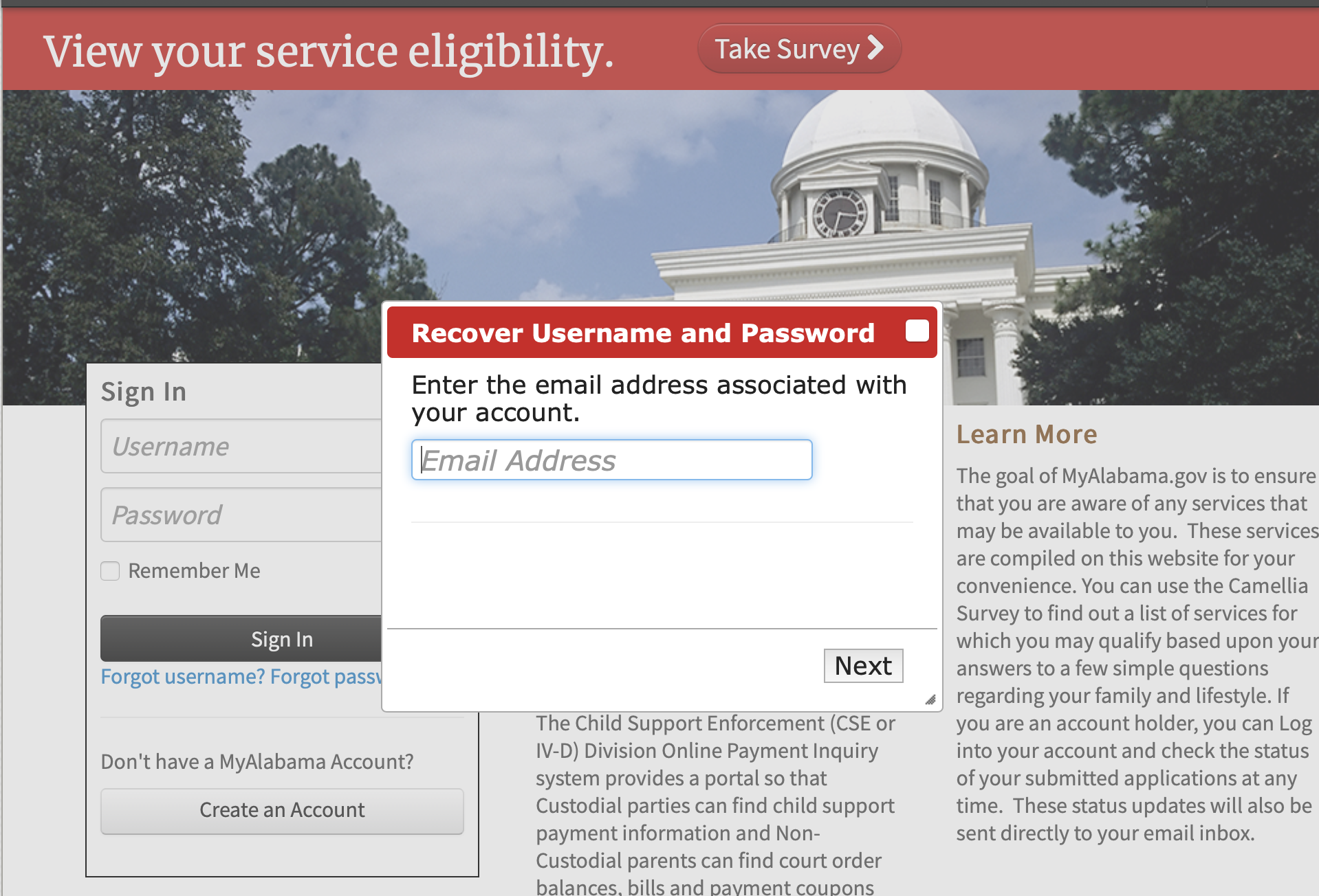 If you are trying to login your My Alabama Account to access or apply for benefits, but have forgotten your Username, we can help. Follow these instructions to recover your MyAlabama.gov Username for account login.