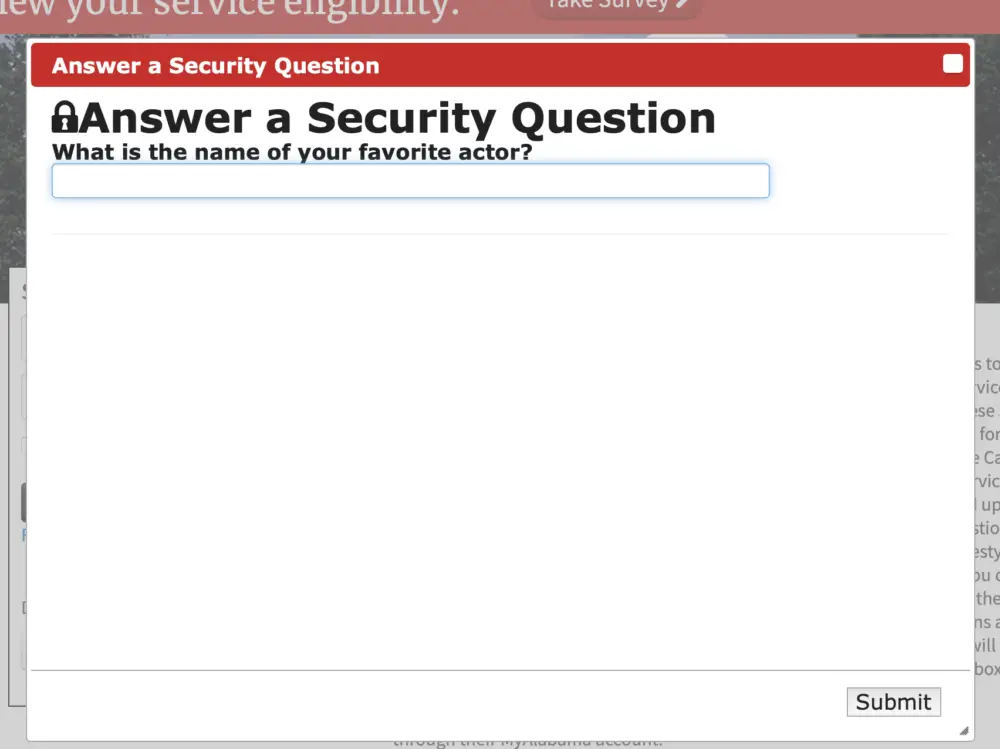 Once you have entered the correct Username and SSN, you should receive a message that asks you to answer a security question. These are questions you set up when you created your MyAlabama.gov Account. For help, please refer to the screenshot below.