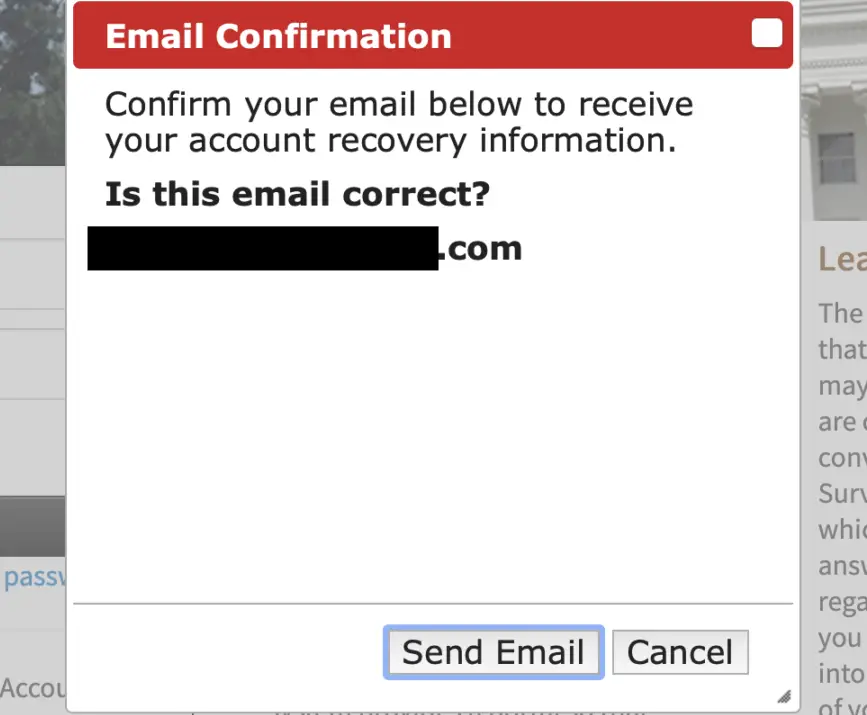 If you have answered your security question correctly, you will see a new message asking you to confirm your email. If the email shown is correct and you have access to it, click the “Confirm” button.