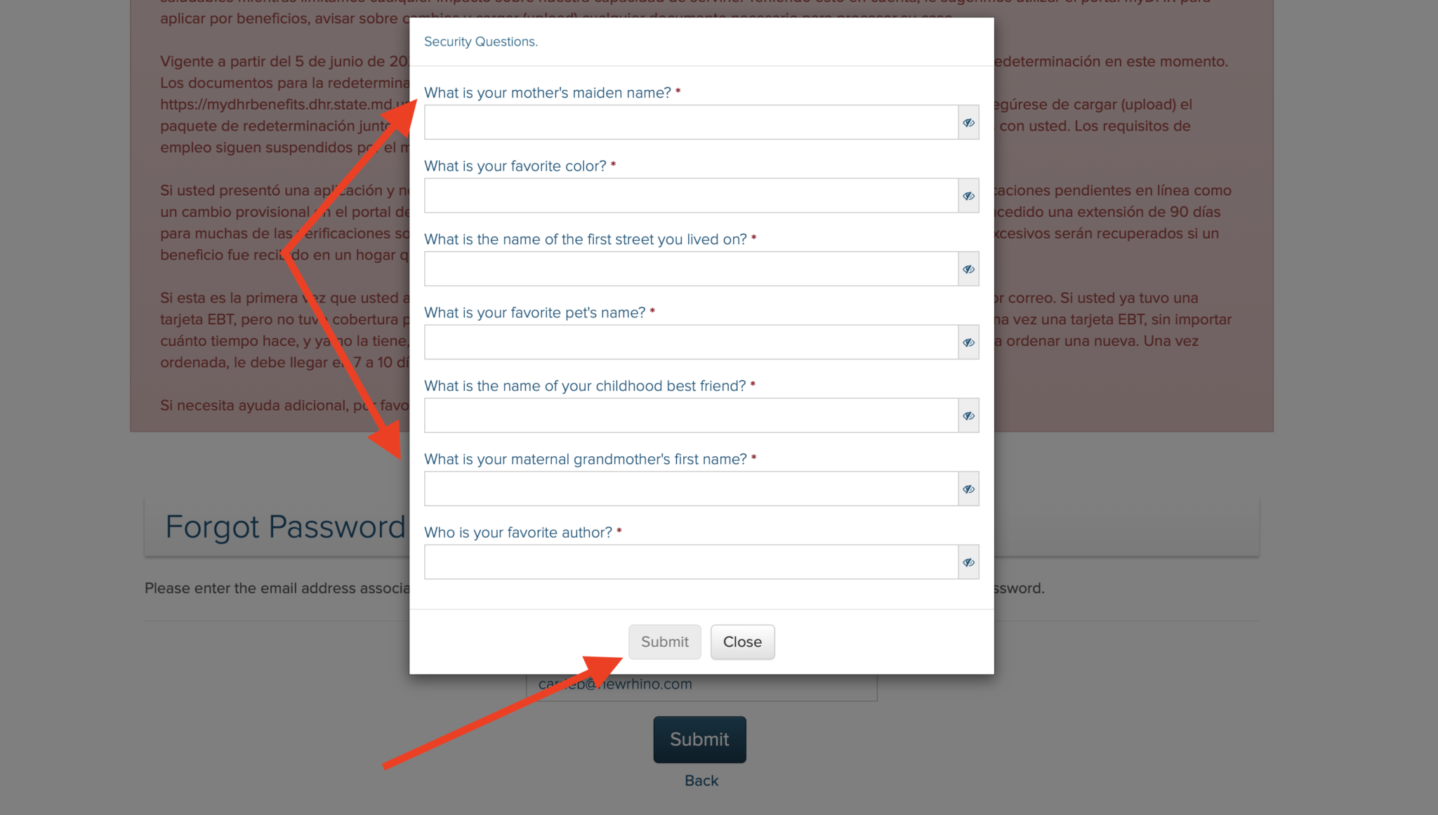 To reset and update your password using the security questions, type in your answer to the seven (7) security questions displayed. After answering each question, click the “Submit” button.