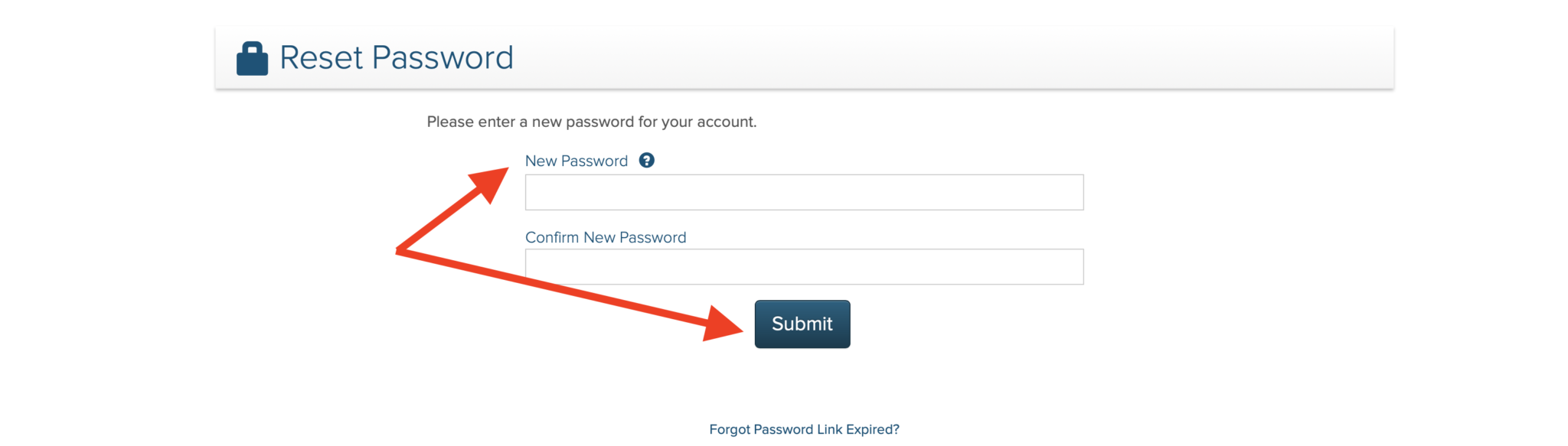 Click the link and follow the instructions to create your new password. On the page, type your new password twice, then click the “Submit” button.