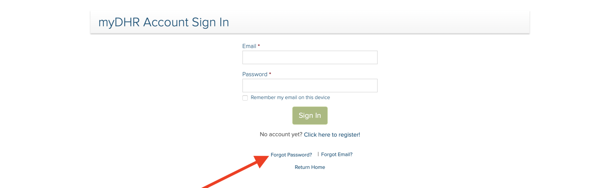 On the Sign-In Page, click the link that says, “Forgot Email?” A box will appear with instructions on how to recover your MyDHR MD email address.