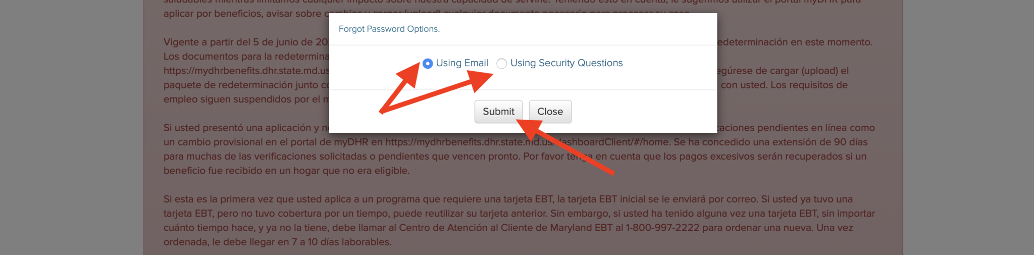 After clicking submit, a box will appear asking you how you would like to reset your My DHR Maryland Password – by Email or Security Questions. Select your option, then click the “Submit” button.