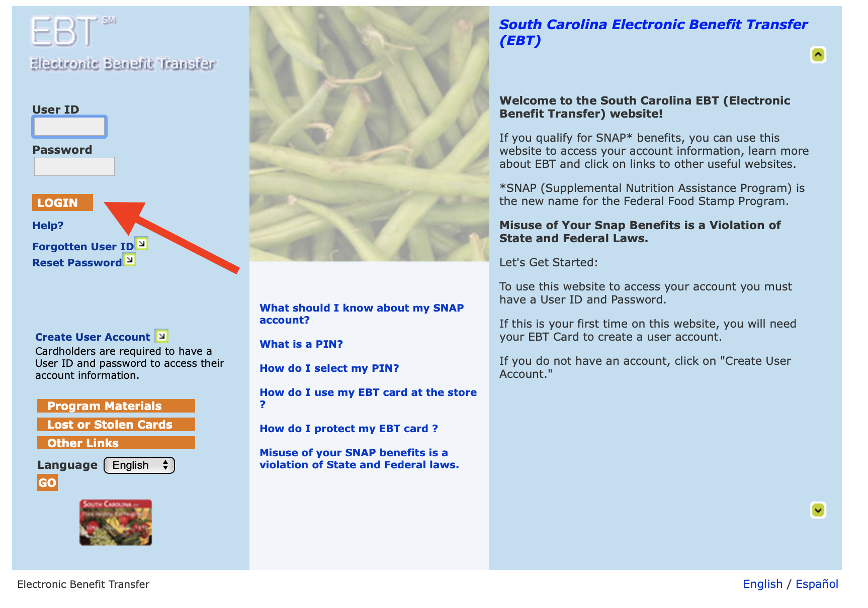 Once you are on the site, enter your User ID and Password in the login section on the left-side of the page. You must enter your User ID and Password to login to your South Carolina EBT account. After that, you will be able to check your EBT balance.