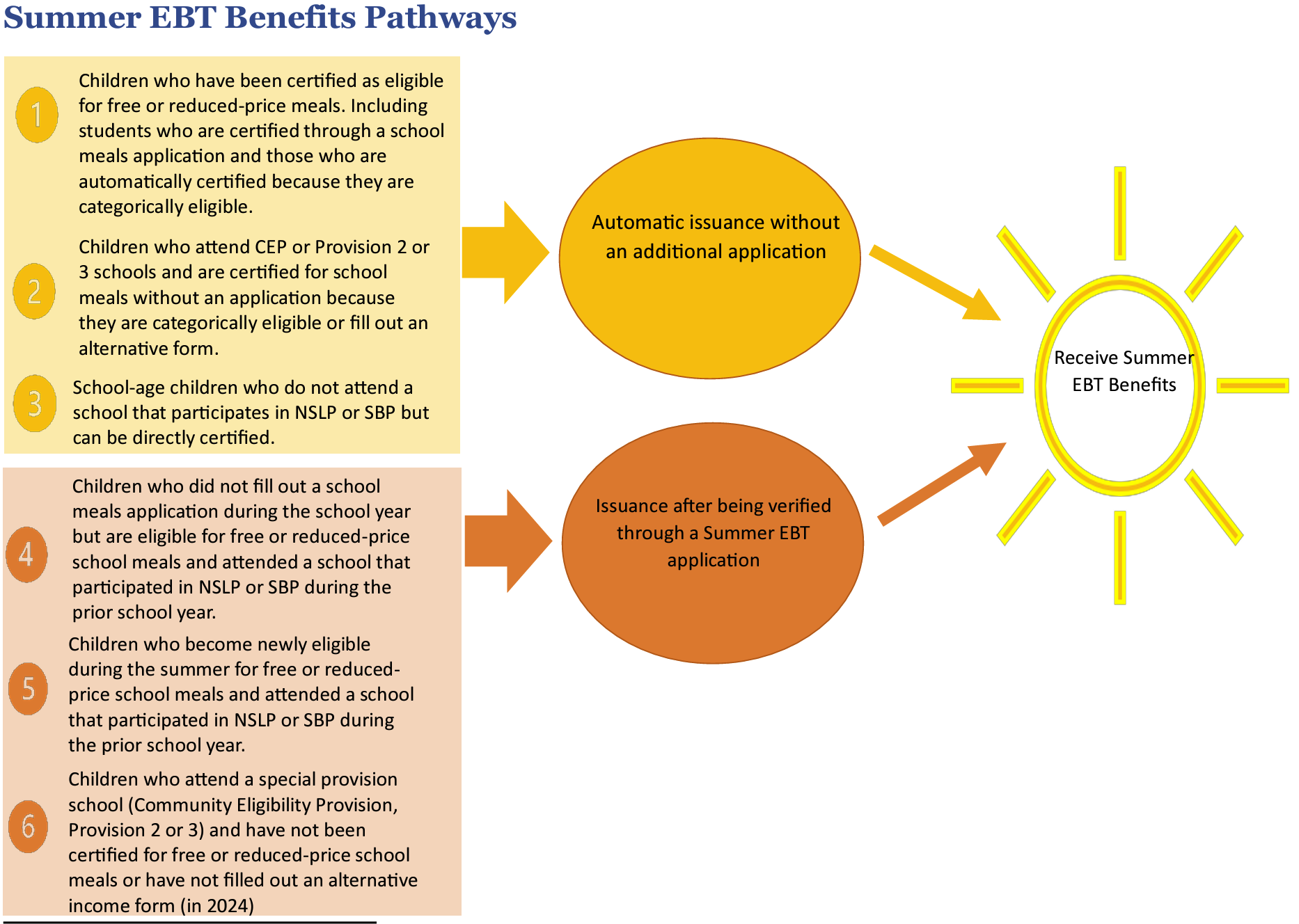 There are several ways to qualify for 2024 Summer EBT benefits. The Summer EBT is intended to reduce food insecurity for children who lose access to free and reduced price meals through the National School Lunch Program (NSLP) and School Breakfast Program (SBP) during the summer when school is not in session.
