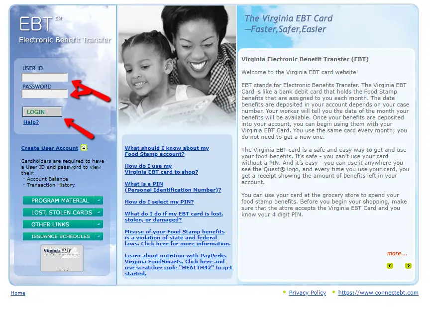 In addition, if you do not have a Virginia Connect EBT login, click the “Create User Account” link located below the Login Portal. You will see instructions on how to create an account for access to your Virginia EBT Card online.